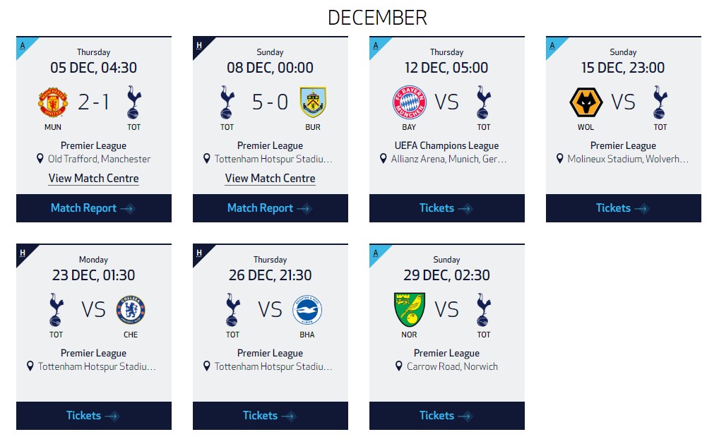 다음은 앞으로 남은 12월 토트넘 훗스퍼의 경기 일정입니다.